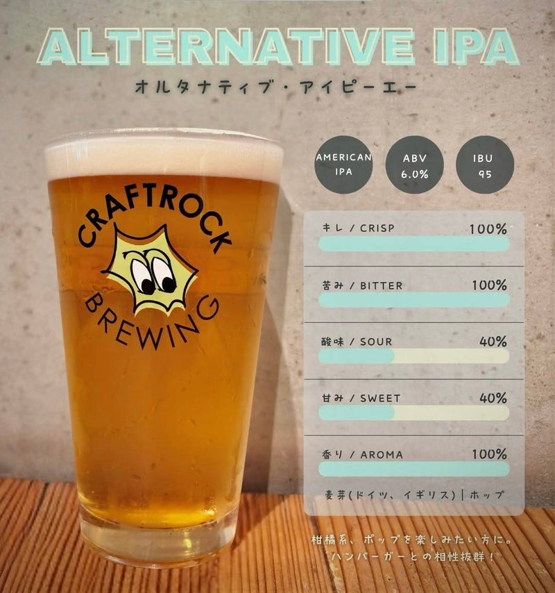 CRAFTROCKの一番人気にして、フラッグシップビール—。それが「Alternative IPA」です。グレープフルーツを丸齧りしたような柑橘感、そしてトロピカルさ、グラッシーさと心地よい苦味が口の中で爆発! -